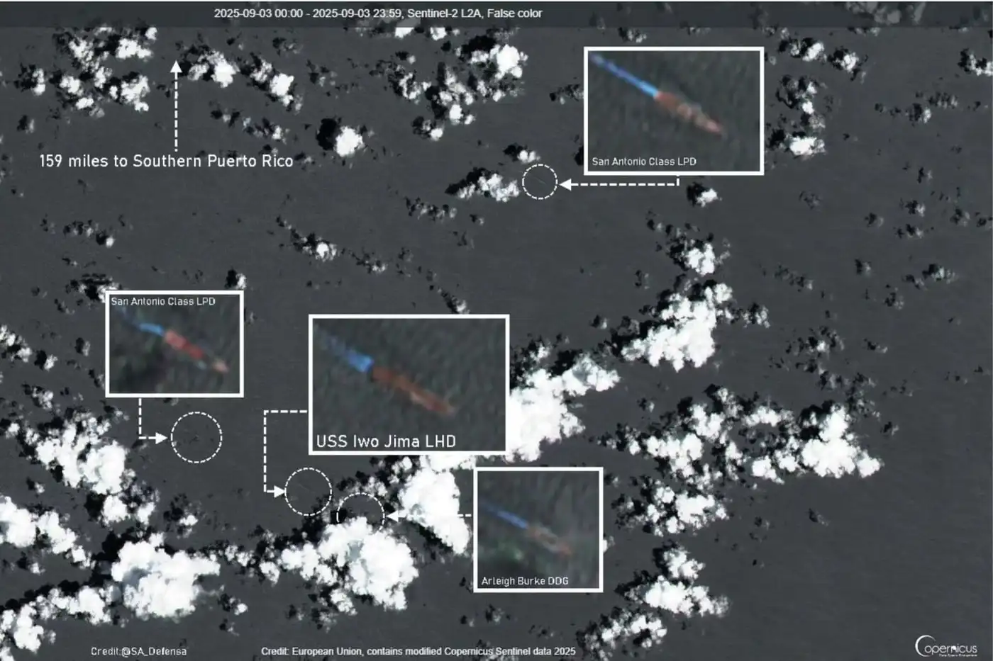 Спутниковый снимок, на котором зафиксирована группа ВМС США во главе с USS Iwo Jima (LHD-7), сопровождаемая двумя десантными кораблями класса San Antonio и эсминцем класса Arleigh Burke в Карибском море.