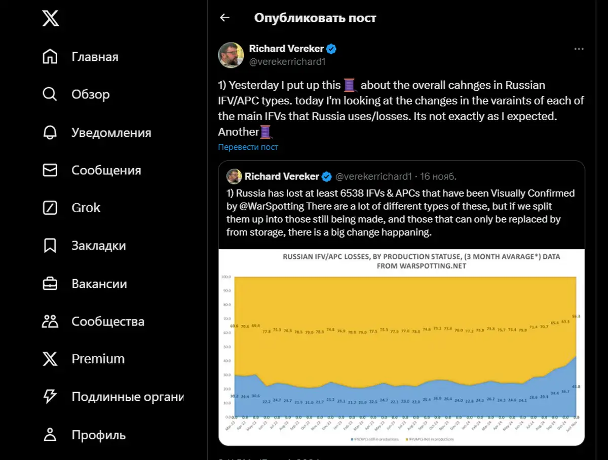 OSINT-исследователь Ричард Верекер обнаружил странность в принципах модернизации российских БМП во время составления графиков потерь ВС РФ. Он отмечает, что все больше старых БМП-1 и БМП-2 получают дополнительную защиту бортов после ремонта либо реактивации с баз хранения.