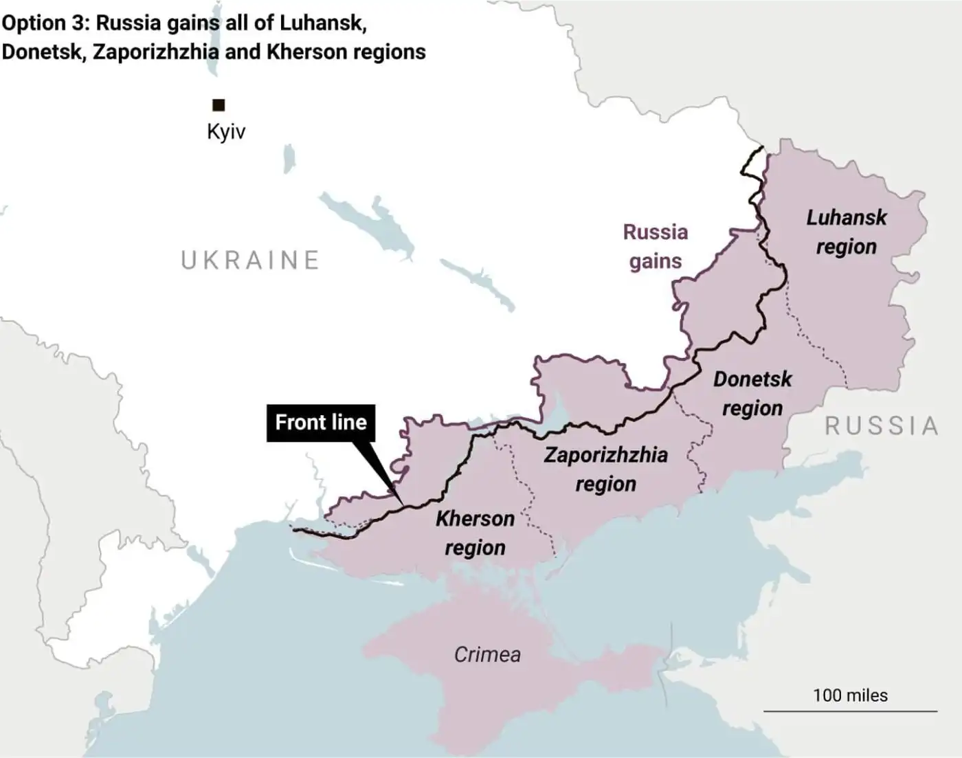 Четвертый вариант — передача России Луганской, Донецкой и Запорожской областей в обмен на освобождение Херсонской и Харьковской областей.