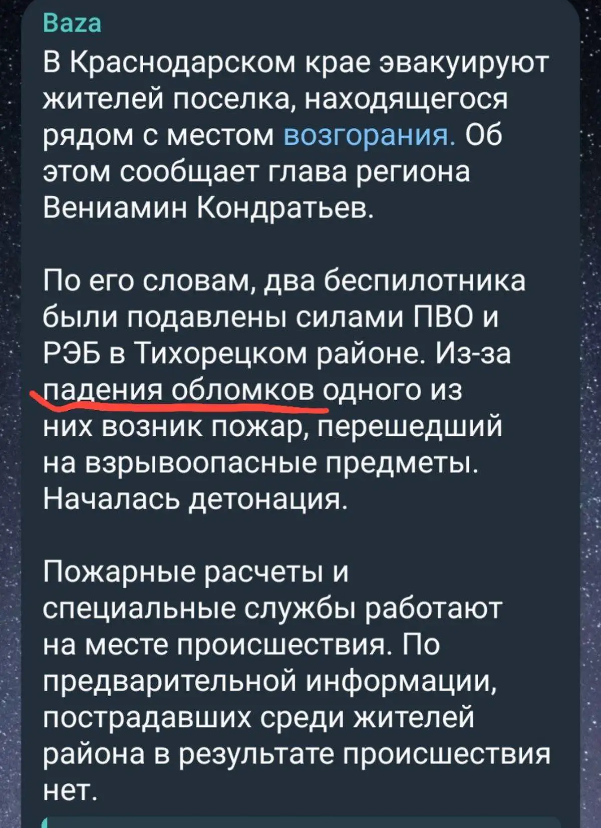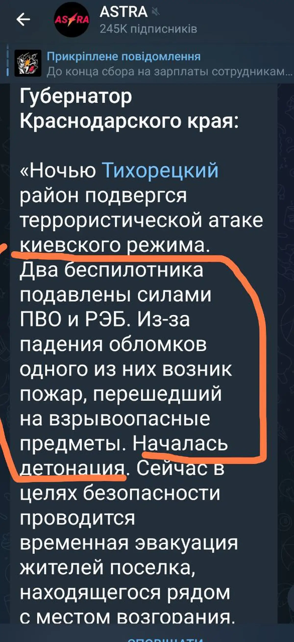В г. Тихорецк, Краснодарский край, беспилотниками Украины атакован 23-й арсенал ГРАУ — второй после уничтоженного 107-го арсенала под городом Торопец.