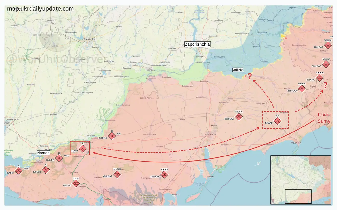 Параллельно Unit Observer отмечает другие перемещения. Из закрытых российских чатов просачивается информация: потрёпанная 11-я десантная бригада уходит с Сумского направления на Херсонский, освобождая место для 104-й дивизии ВДВ, которую двинули на Запорожье. Контекст понятен — 11-я с августа прошлого года несла потери на Сумско-Курском участке, а 104-я дивизия после изнуряющей кампании под Крынками только недавно восстанавливалась.