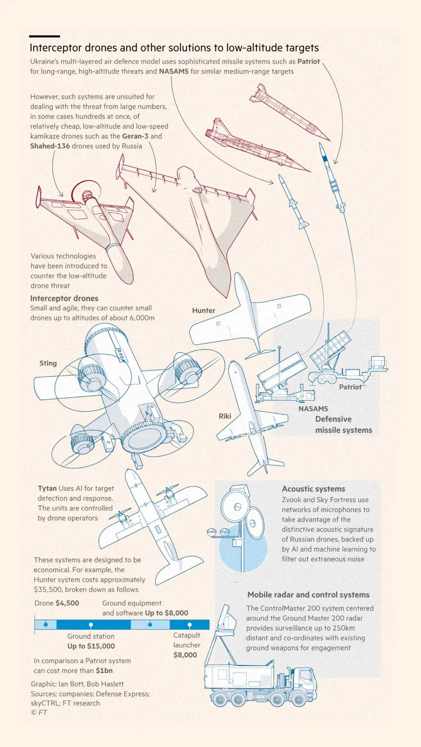 Украина стала пионером в разработке дешёвых методов противовоздушной обороны, когда внедрила акустические сенсоры для отслеживания дронов и сотни мобильных групп с тяжёлыми пулемётами. Однако РФ изменила тактику, поднимая дроны выше, вне досягаемости зенитных орудий, и начав посылать их большими волнами. В то же время у Киева всё меньшие запасы ЗРК малой и средней дальности, которые значительно дороже российских Shahed. При этом дрон-перехватчик Sting стоит 2100 долларов.
