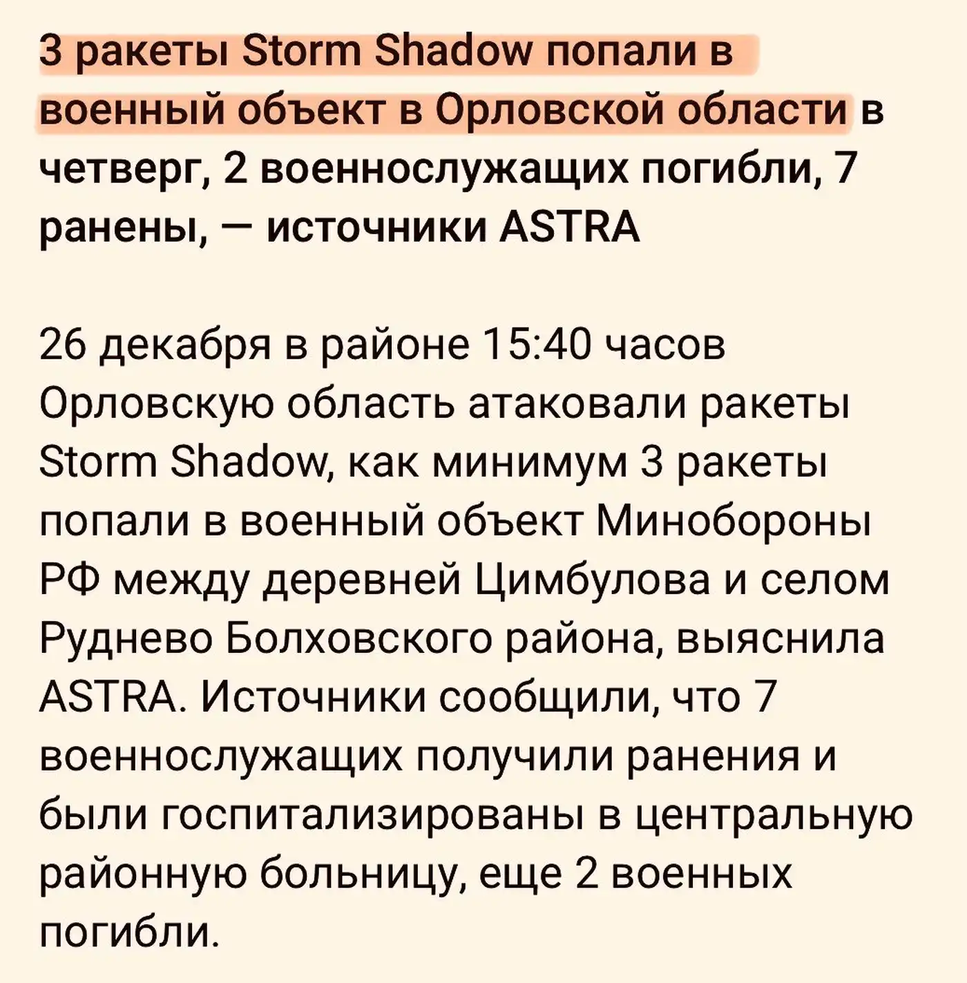 Как сообщают источники, по объекту в районе деревни Цимбулово и села Руднево (Болховский район) были выпущены как минимум три ракеты класса Storm Shadow. В российском военном ведомстве подтвердили факт удара, отметив, что два военнослужащих погибли, ещё семь получили ранения и были госпитализированы в районную больницу.