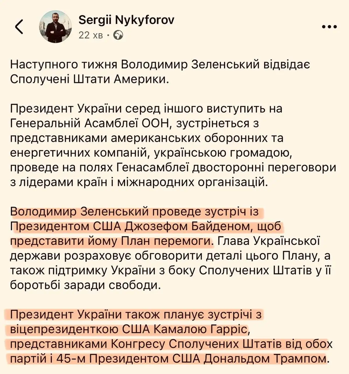 Пресс-секретарь украинского президента сообщил, что Зеленский также выступит на Генеральной Ассамблее ООН и встретится с кандидатом в президенты США от республиканцев Дональдом Трампом.