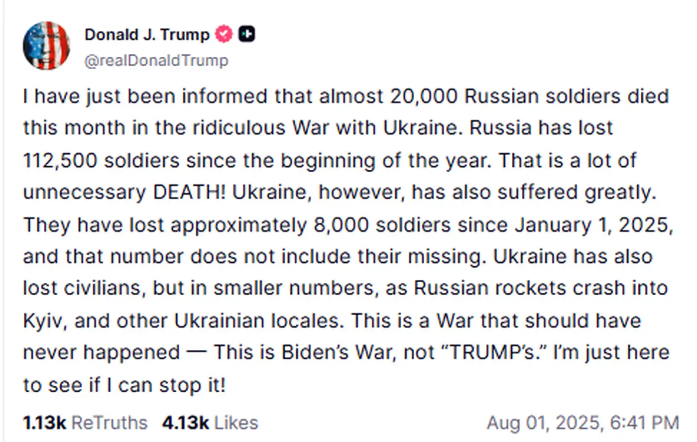 Трамп утверждает, что в этом месяце в Украине погибло почти 20 000 российских солдат, в результате чего общие потери России с января достигли 112 500 человек. Он оценивает потери Украины в 2025 году примерно в 8000 человек, не считая пропавших без вести. Также Трамп говорит, что в Украине из-за российских атак гибнут гражданские, но намного меньше.