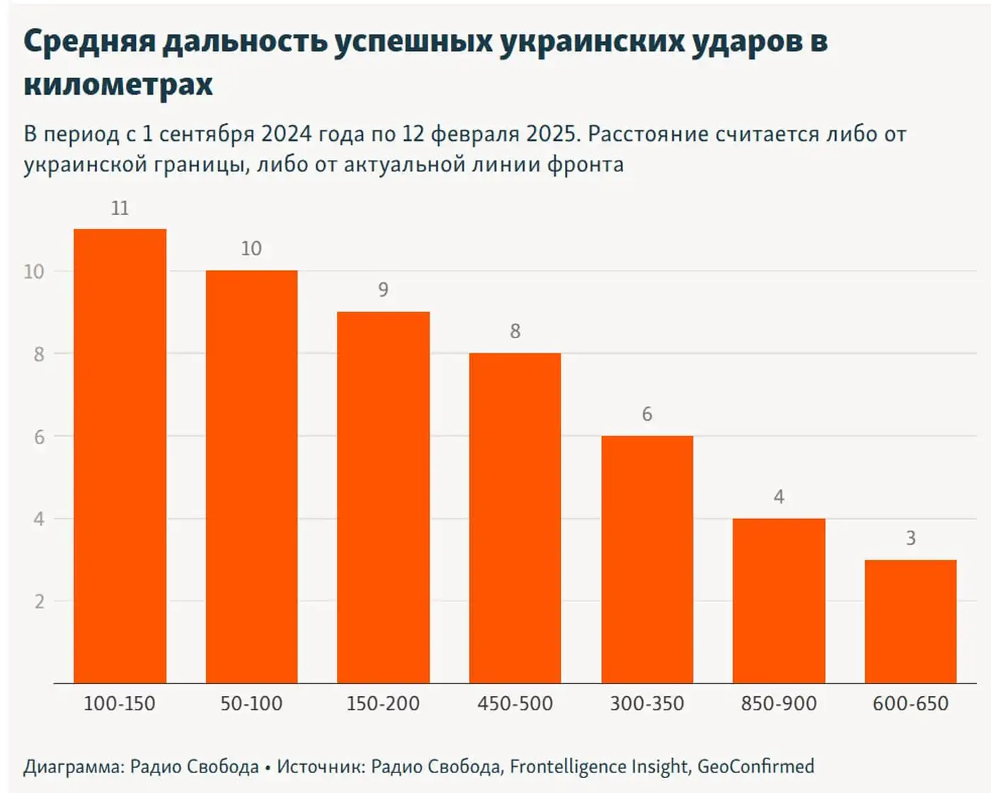 - Дальность атак: Большинство ударов приходилось на цели, расположенные в 100–150 км от границы или линии фронта. Однако были случаи атак на расстоянии до 1000 км, включая удары по объектам в Чечне и Ленинградской области.