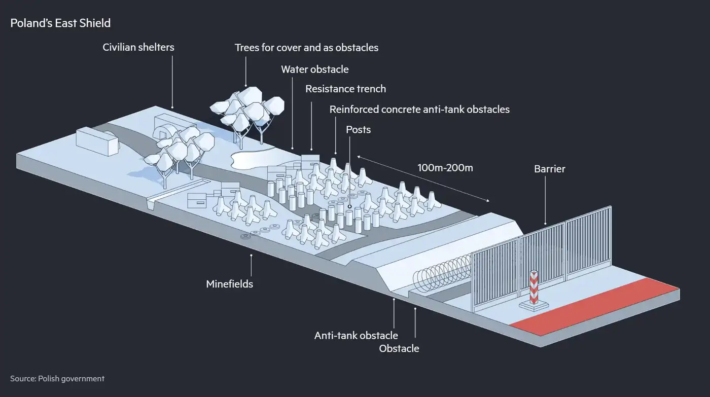 Самый амбициозный проект — это «Восточный щит». Он включает системы ПВО, противотанковые рвы, барьеры и минные поля. В 2023 году польское правительство выделило на него 10 миллиардов злотых (2,3 миллиарда евро), а позже премьер Туск добился включения проекта в оборонные приоритеты ЕС, что открыло доступ к европейскому финансированию.