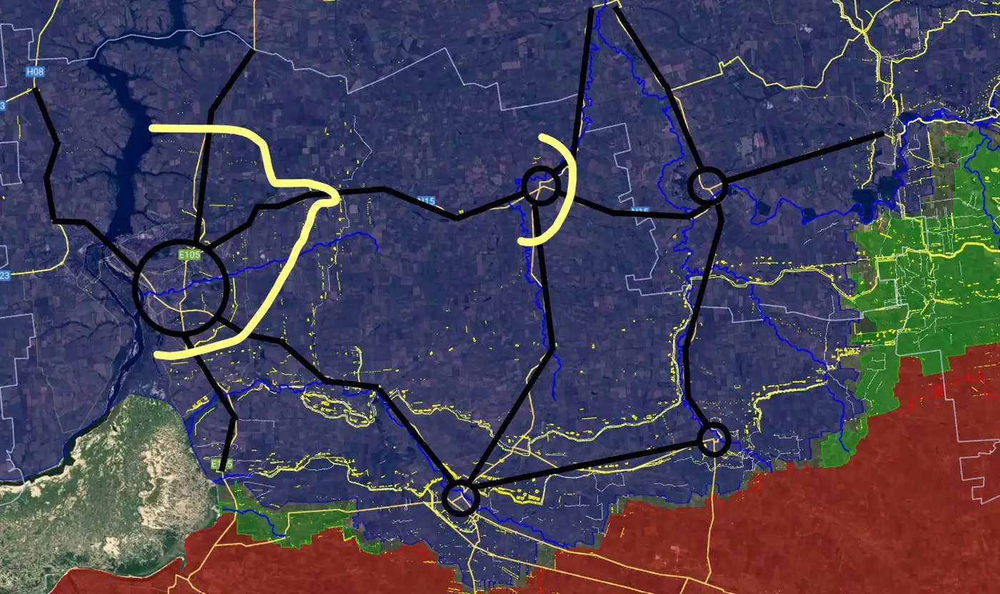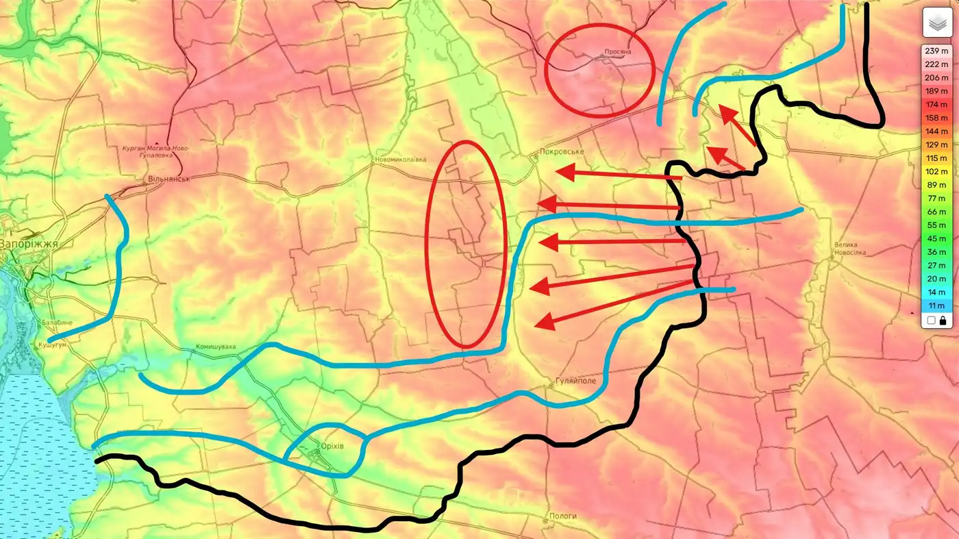 Российская армия продвигается на северо-восток, параллельно автотрассе H15, стараясь избегать Гавриловки, где сходятся две реки и линии обороны — болото там гарантировано. Продвижение с юга выглядит маловероятным, несмотря на многочисленные попытки.