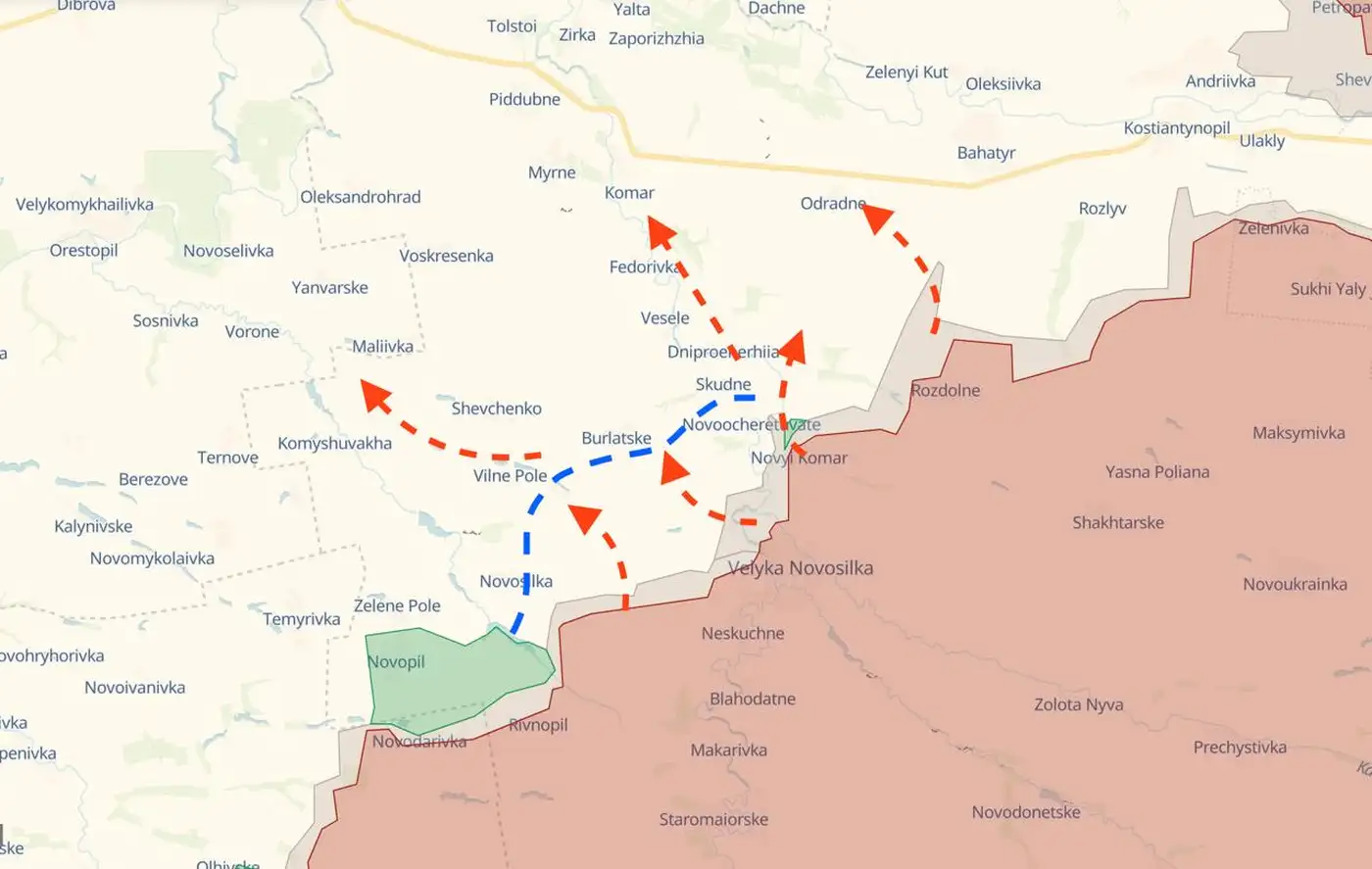 Так и Великая Новоселка. Авторы поста ссылаются на информацию ISW от 25 ноября прошлого года. В тот момент поселок еще сохранял некоторое логистическое значение. Например, для опорных пунктов в селах Макаровка, Благодатное, Нескучное и Времьевка. Но даже тогда российский прорыв с юго-востока нанес серьезный удар по логистической ценности Великой Новоселки. Сейчас же, в последнюю неделю, когда поселок был почти окружен, а все дороги перерезаны, эта ценность равнялась нулю.