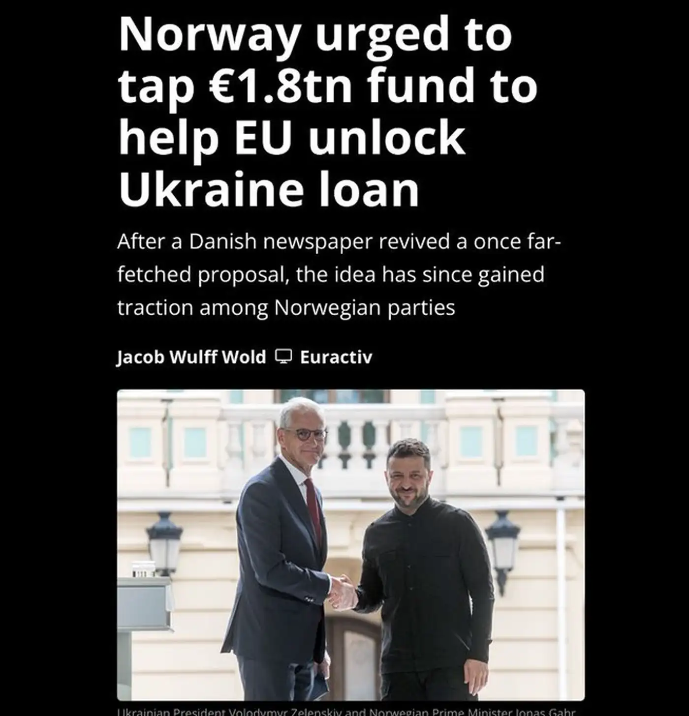 Все чаще звучат призывы к Норвегии использовать свой суверенный Фонд благосостояния в € 1,8 триллиона долларов, чтобы помочь продвинуться вперед в вопросе предоставления ЕС репарационного кредита для Украины в размере 140 миллиардов долларов. Это произошло после того, как датская газета оживила когда-то нереальную идею во время встречи лидеров ЕС в прошлом месяце. Пять норвежских политических партий призвали Осло вмешаться, чтобы преодолеть обеспокоенность Бельгии по поводу использования замороженных российских суверенных активов для финансирования репарационного кредита Киеву в размере 140 миллиардов евро.