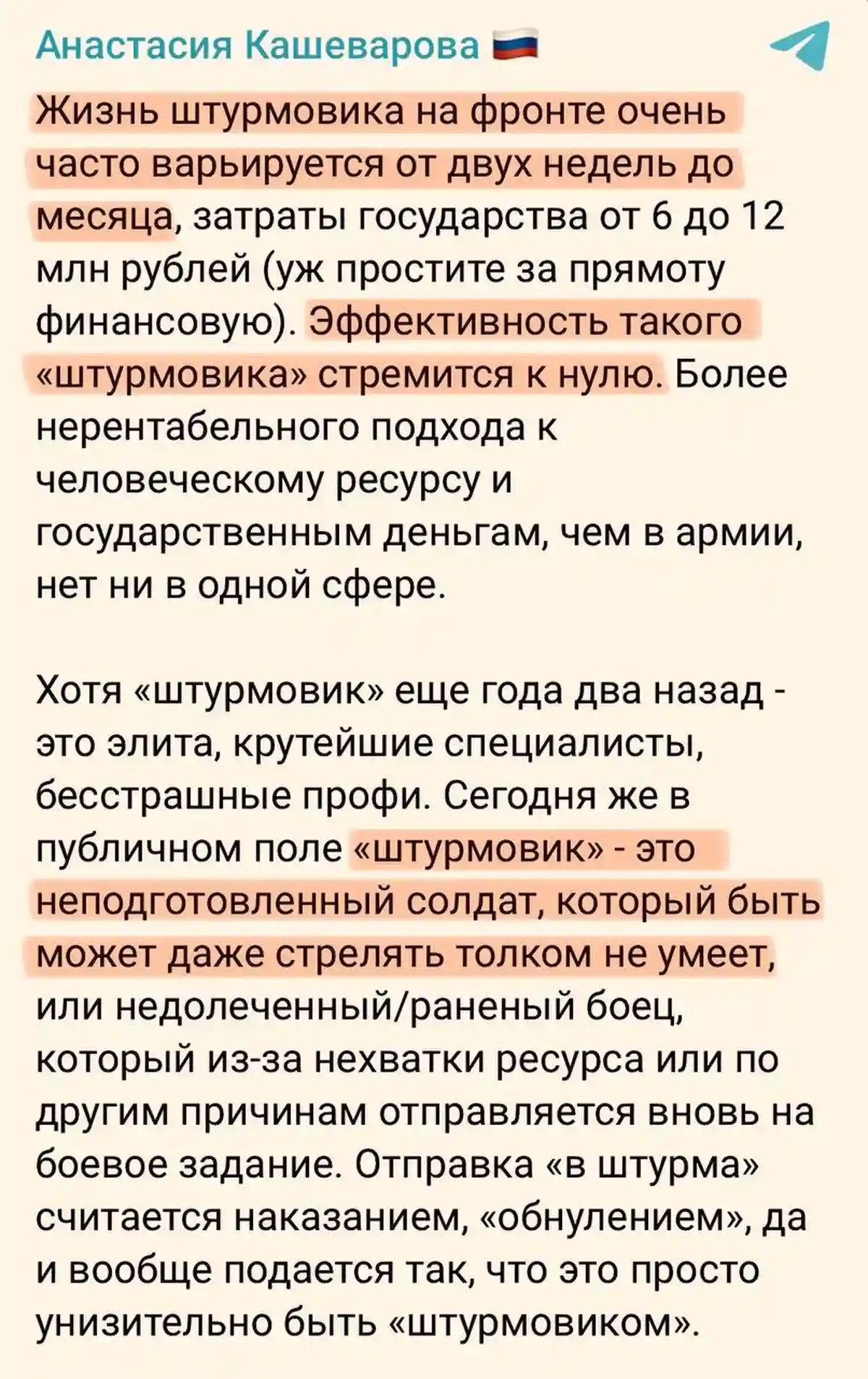 «Жизнь штурмовика на фронте очень часто варьируется от двух недель до месяца, а затраты государства на одного из них составляют от 6 до 12 миллионов рублей», — жалуются российские «эксперты». Но циничные цифры затрат не показывают настоящую цену — человеческие жизни, поглощаемые этой бессмысленной агрессией против Украины. Каждый день потери растут, и люди, которые могли бы жить мирной жизнью, гибнут за интересы кремлёвских политиков.